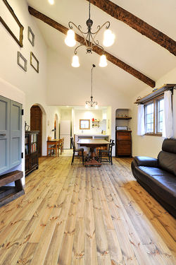 エイジング加工されたフローリングや梁、漆喰壁に薪ストーブ、実際に教会で使われていたレンガやアンティークなどが、丸みを帯びた洞穴ラインとあいまって、ふんわりやさしく包み込んでくれるように。